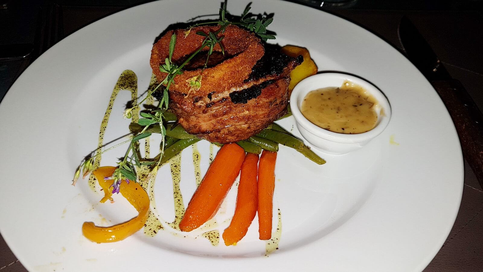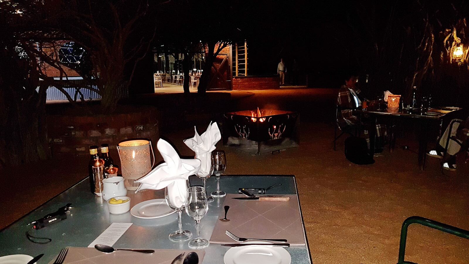 Der zentrale Bereich ist großzügig vom Flair aber nicht unser Geschmack, das Wellblechdach vermittelt leider den Charakter einer Halle. Der Blick von der Frühstücksterrasse über die Wasserstelle hinweg in den Busch ist beruhigend und man kann dort viele Tiere und Vögel beobachten. Außerhalb des Essbereiches gibt es jedoch einige lauschige Separees wo wir uns gleich für beide Abende einen Tisch reservierten. Das Essen ist sehr gut, toll angerichtet und das Personal sehr freundlich und hilfsbereit. Das Dinner im Separee bei einem Lagerfeuer, eingehüllt in Decken war ein Genuss. Über uns der Sternenhimmel und ein Schakal welcher immer wieder neugierig seine Runde dreht, dies war genau nach unserem Geschmack.
